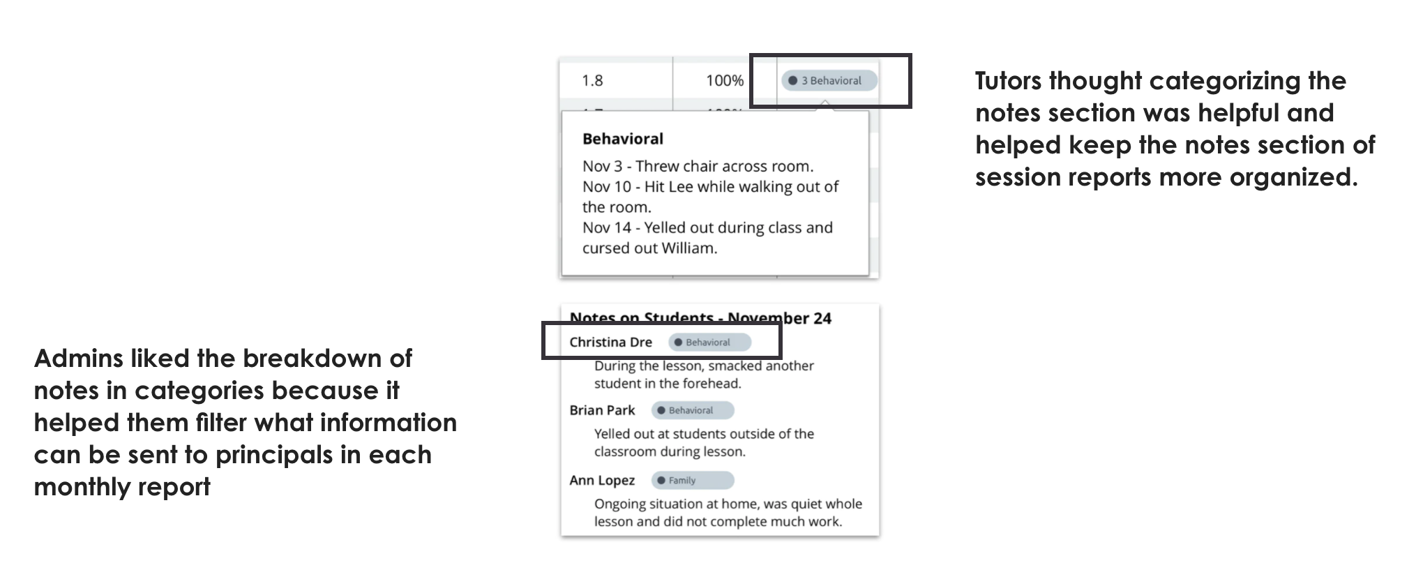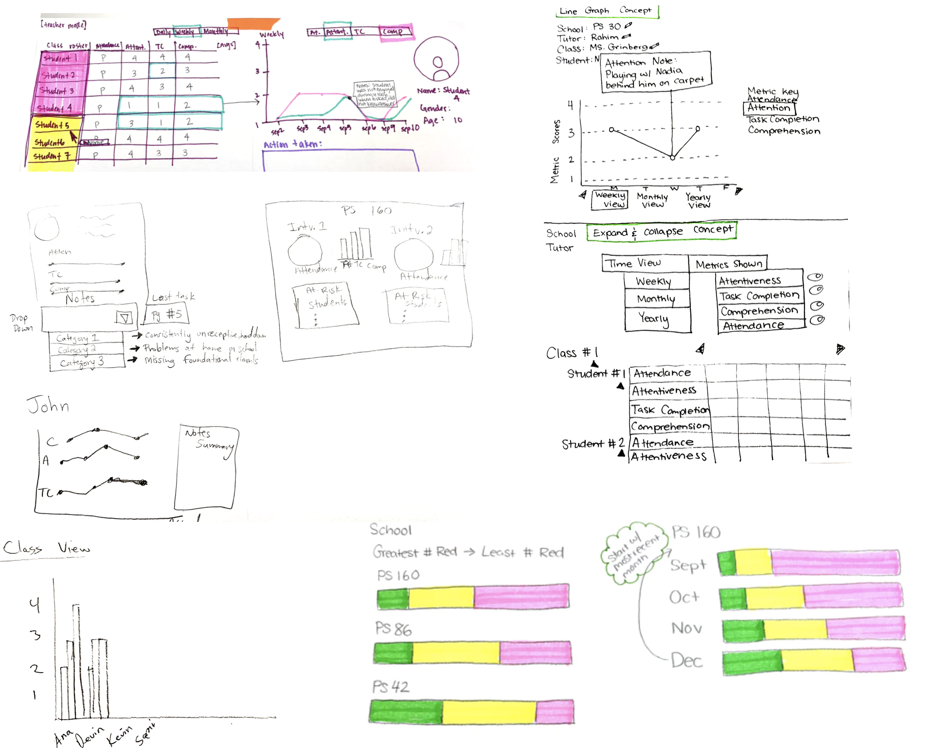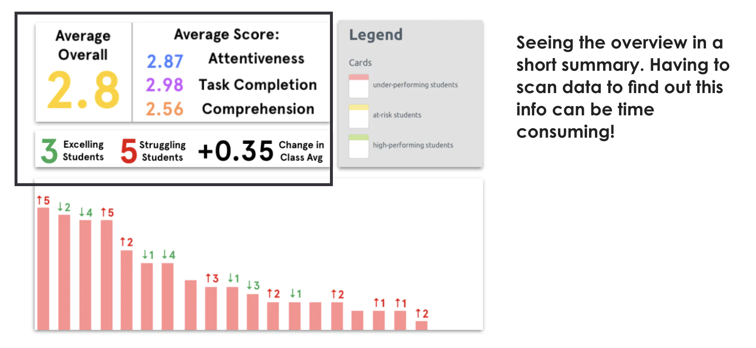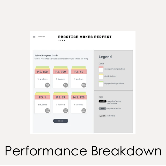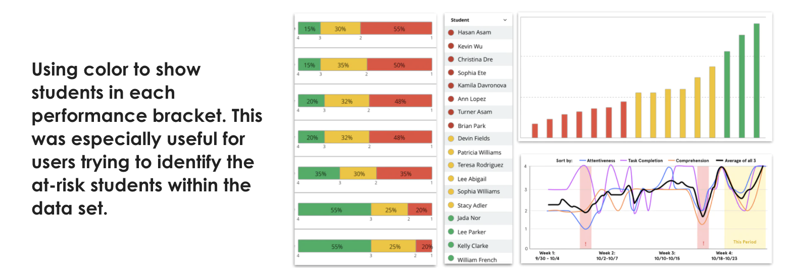 Both interventionists and admins were most interested in identifying at-risk student performance when analyzing student data. With that in mind, we needed our concepts to prioritize struggling students by categorizing each student based on their performance scores.