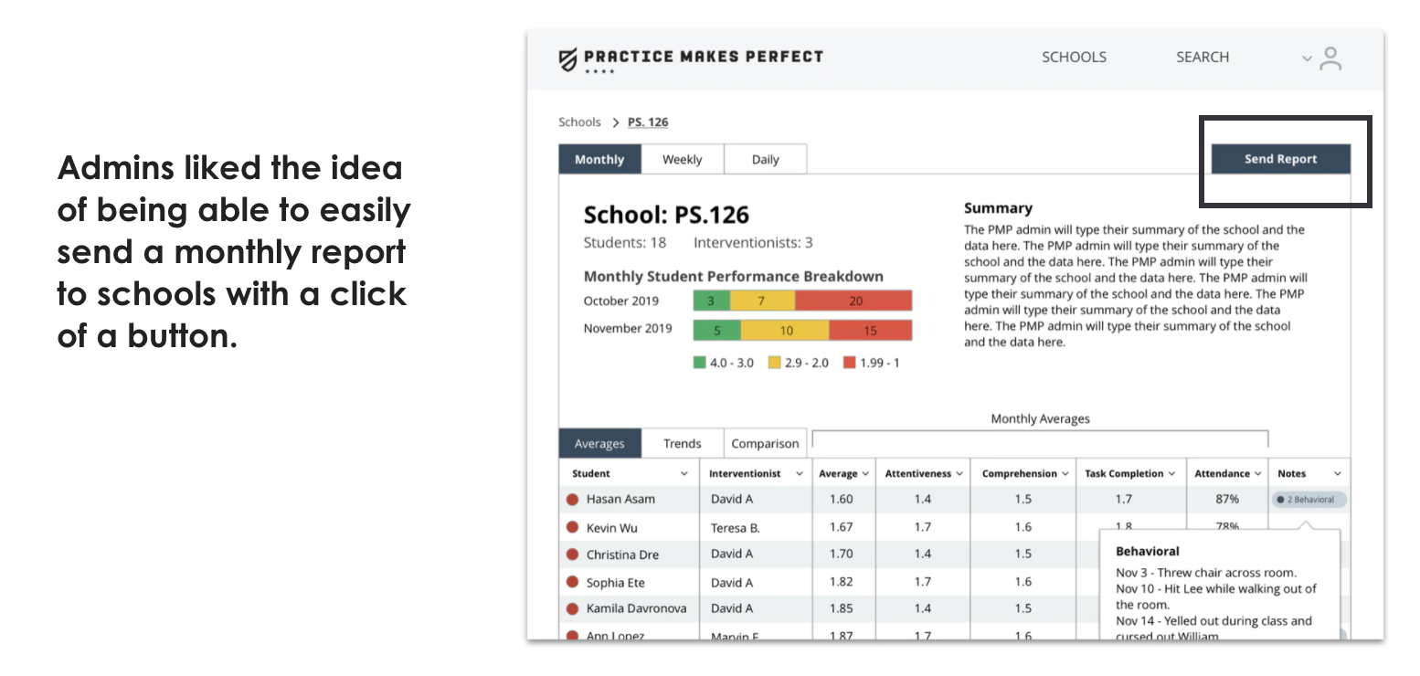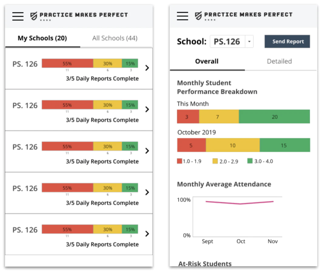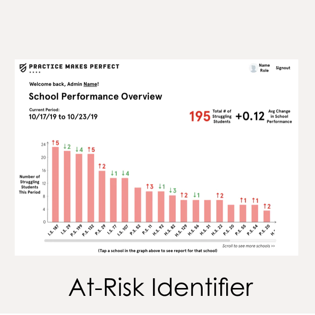 An admin-facing interface that allows users to easily compare data sets, identify at-risk students, easily find trends within data sets, and send monthly reports to school principals.
