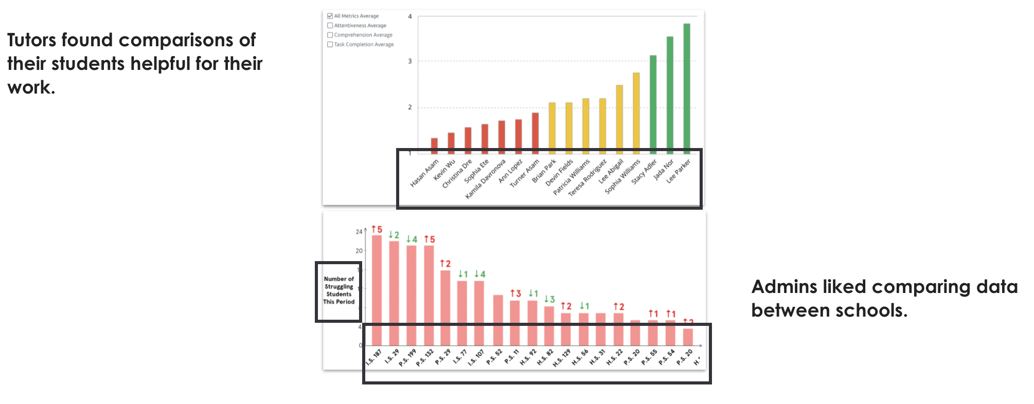 By measuring performance by metric rather than by student, it increases efficiency during each session and helps tutors identify problem areas within each student.