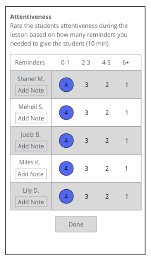 We would like to see a more standard way of inputting data on the tutor mobile app to deliver quality and accurate data sets for PMP. Rather than inputting student data broken down student by student, we suggest designing the app that allows tutors to break down student performance by metric.